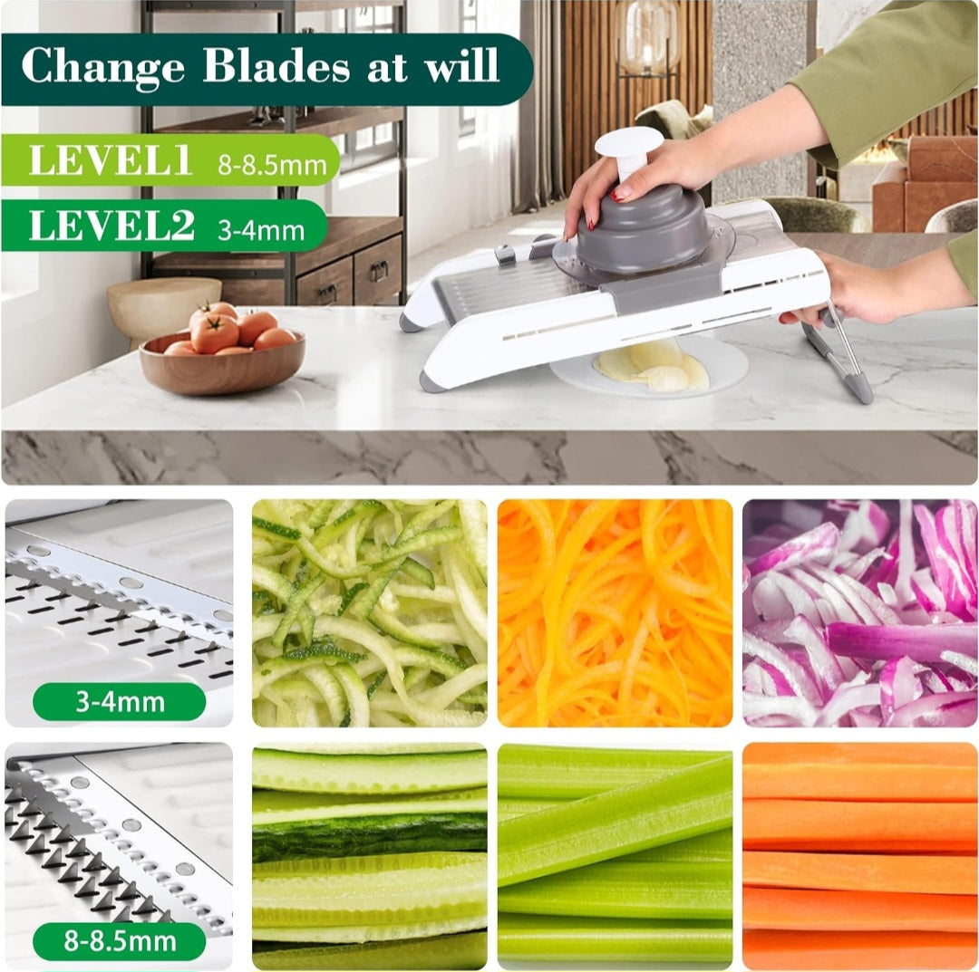 All-In-1 Adjustable Mandoline Slicer. The vegetable cutter is equipped with thickness adjustment knob, Julienne adjustment slider, and adjustable waffle blade, so there are more than 16 ways to cut vegetables. All modes are easy to use without changing accessories. Just adjust the knob. 1. FOUR SLICE SETTINGS: from extremely thin to 5mm thick; 2. TWO JULIENNE SETTINGS: from 2.2mm to 5mm thick; 3. TWO WAFFLE MODES.
