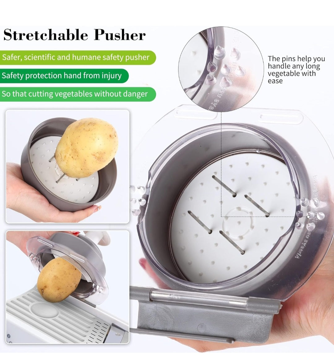 Save Prep Time. The Mandoline Slicer for Kitchen has a variety of modes to meet your different requirements about food thickness and shape. It’s equipped a scientific and humane safety stretchable pusher, so you do not directly touch the food. It can efficiently complete the chopping more safely, and protect your hands from injury.