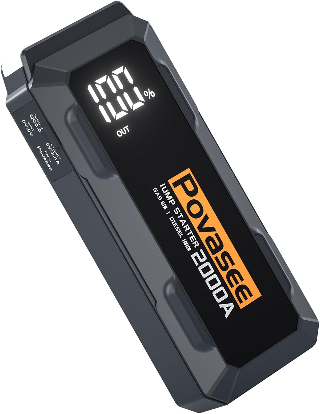 Povasee Jump Starter; A revolutionary 2025 model redesign. This versatile battery jump starter is an impeccable fusion of 6 essential features: Jump Starter, Tire Inflator, Flashlight, SOS signaling, Power Bank, Tire Pressure Gauge. Effortlessly initiates 12V vehicle accessories, transcending the limitations of conventional jump starters