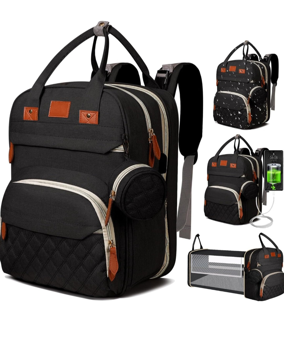 Baby changing station or baby crib with USB charging port and cable. Has a comfortable pad and two foldable rods. Unzip entirely and install the rods, then it turns into a crib. You no longer have to worry about finding a clean place to change diapers in public. You can put your baby to bed after he or she falls asleep. The bed has a sunshade and an windproof cover.