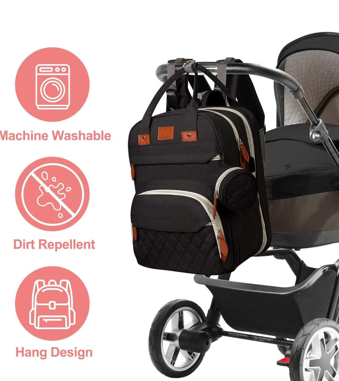 Designed with thick and wide soft padding shoulder straps (2.7in) and an easy-grab handle. The ergonomic design offers you comfortable carrying to reduce fatigue & take care of your spine. Extra adjust straps can be attached to the baby stroller to free your shoulders. It's accessible to convertible, and this backpack diaper bag can be worn as a backpack or handbag or hook to the stroller. Can also be used as a travel backpack.