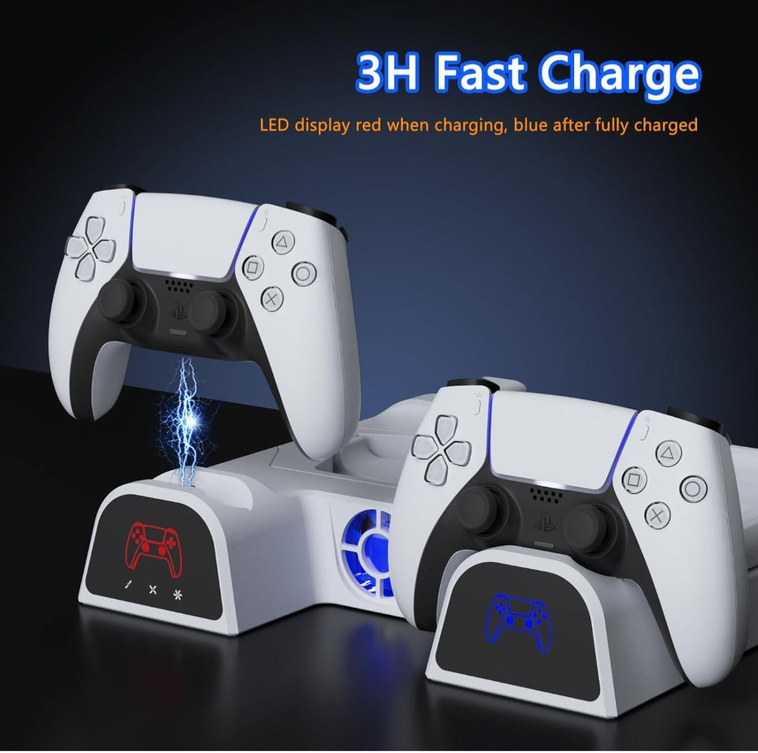 (2 Fast Controller Chargers) 2 charging docks with respective LED indicator (red when charging, blue after fully charged). You can easily dock and fully charge up to 2 wireless controllers at the same time within 3 hours.