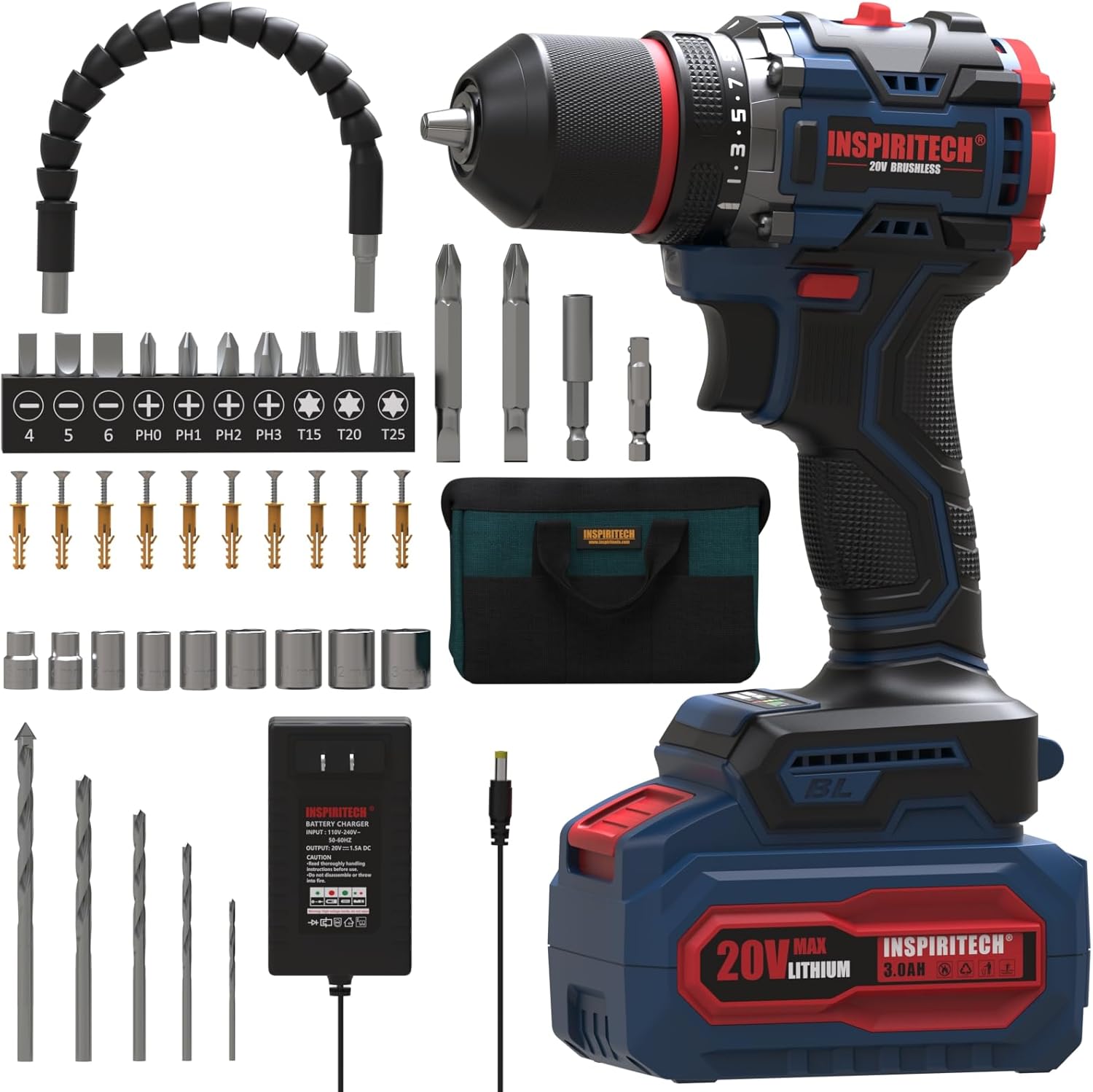 (Household) INSPIRITECH 20V Cordless Drill Set/Brushless Power Drill Set with 3.0Ah Battery and Charger/3.8-Inch Metal Chuck Electric Drill Driver/22 Torque Setting/Drill-Driver Bits and Tool Bag Included