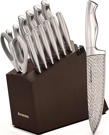 - 【15 Pieces Multipurpose Knife Set】 Includes: 8" Chef knife, 8" Slicing knife, 7" Santoku knife, 8" Serrated bread knife, 5" Utility knife, 3.5" Paring knife, 6 Pcs 4.5" serrated steak knife, kitchen shear, and black hard wood knife block with built-in knife sharpener.
