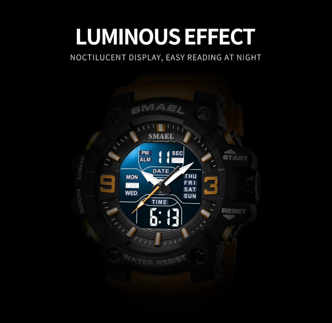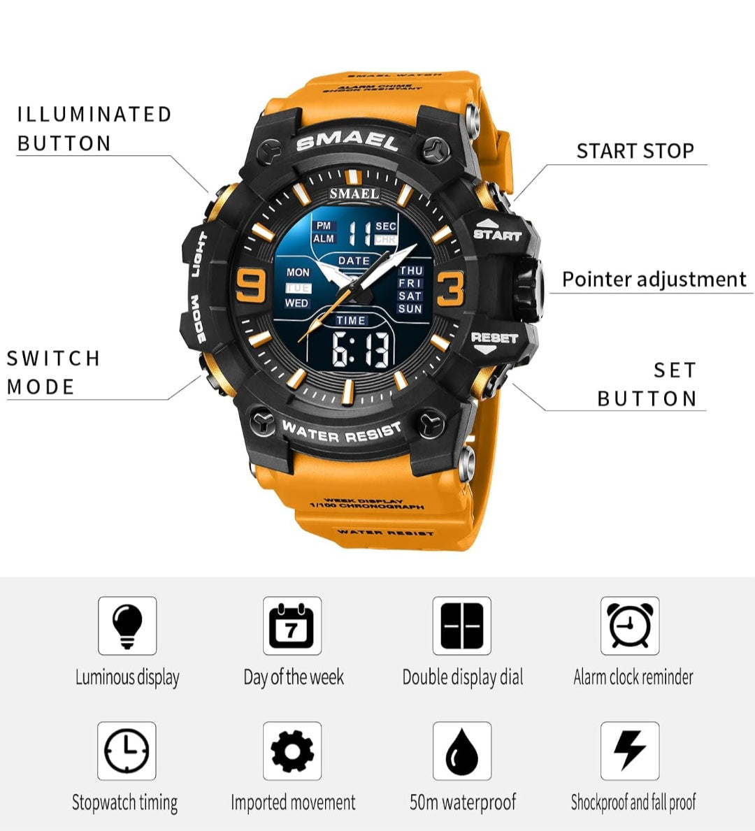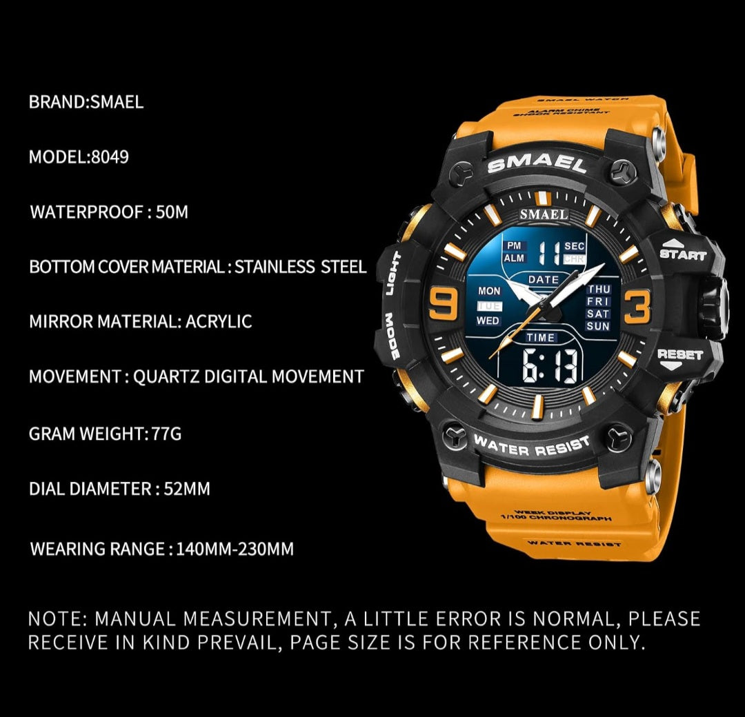 Multi-functional digital watch: The Smael 8049 watch is packed with features, including an alarm, stopwatch, countdown timer, and dual time zone display. This makes it a versatile choice for a variety of activities and situations.