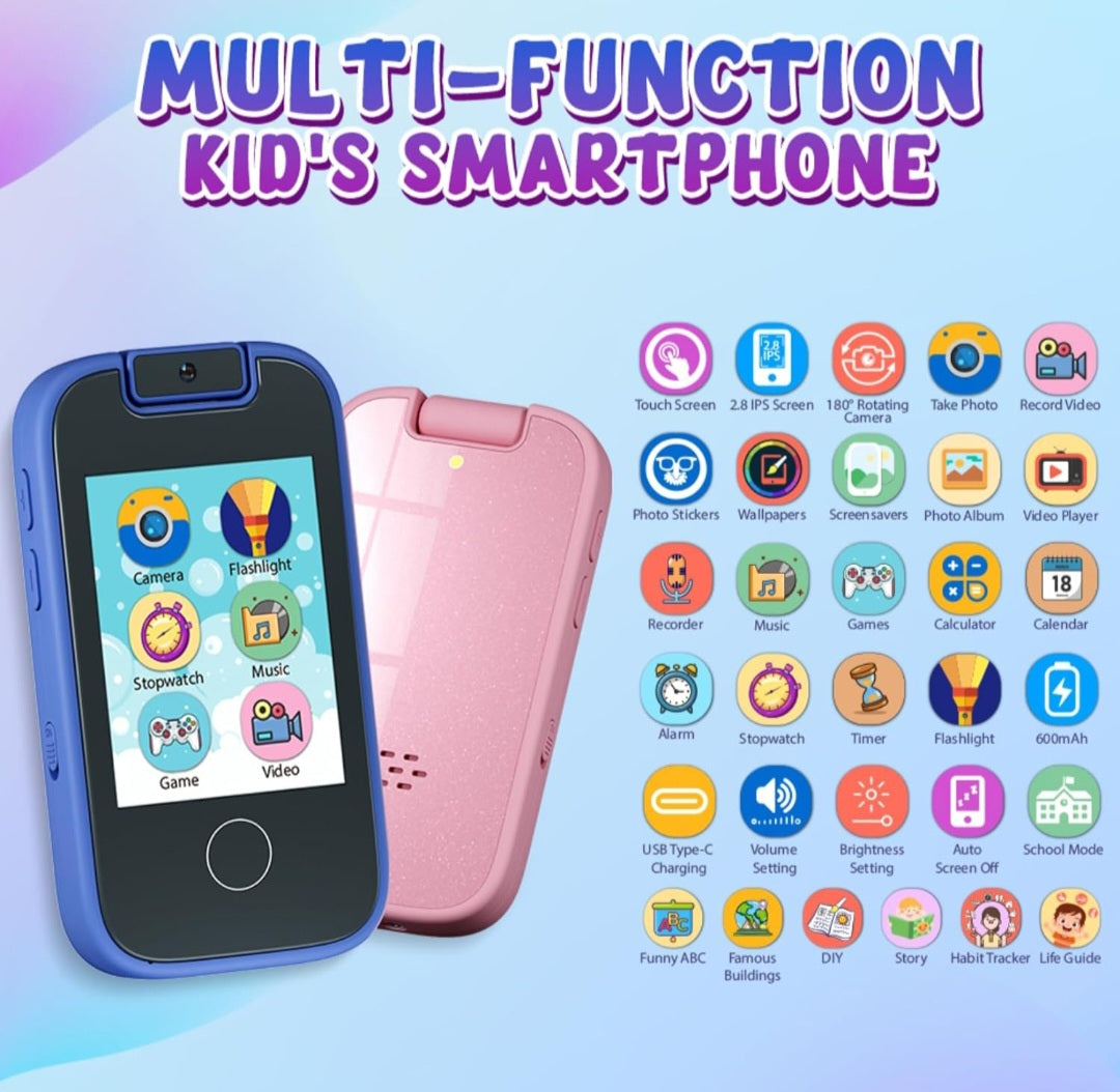 The kids smart phone is equipped with a dual Camera & MP3 Player. It has auto focus, 8.0 Mega Pixels and Video. The device also features a high-quality speaker that supports a 3.5mm headphone jack, so kids can learn and enjoy music.