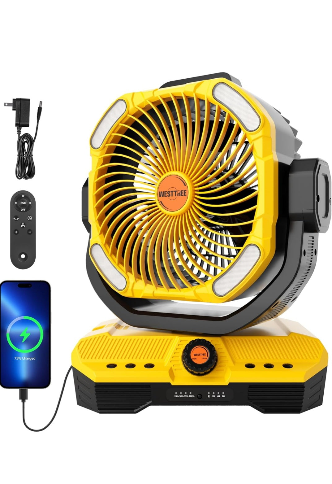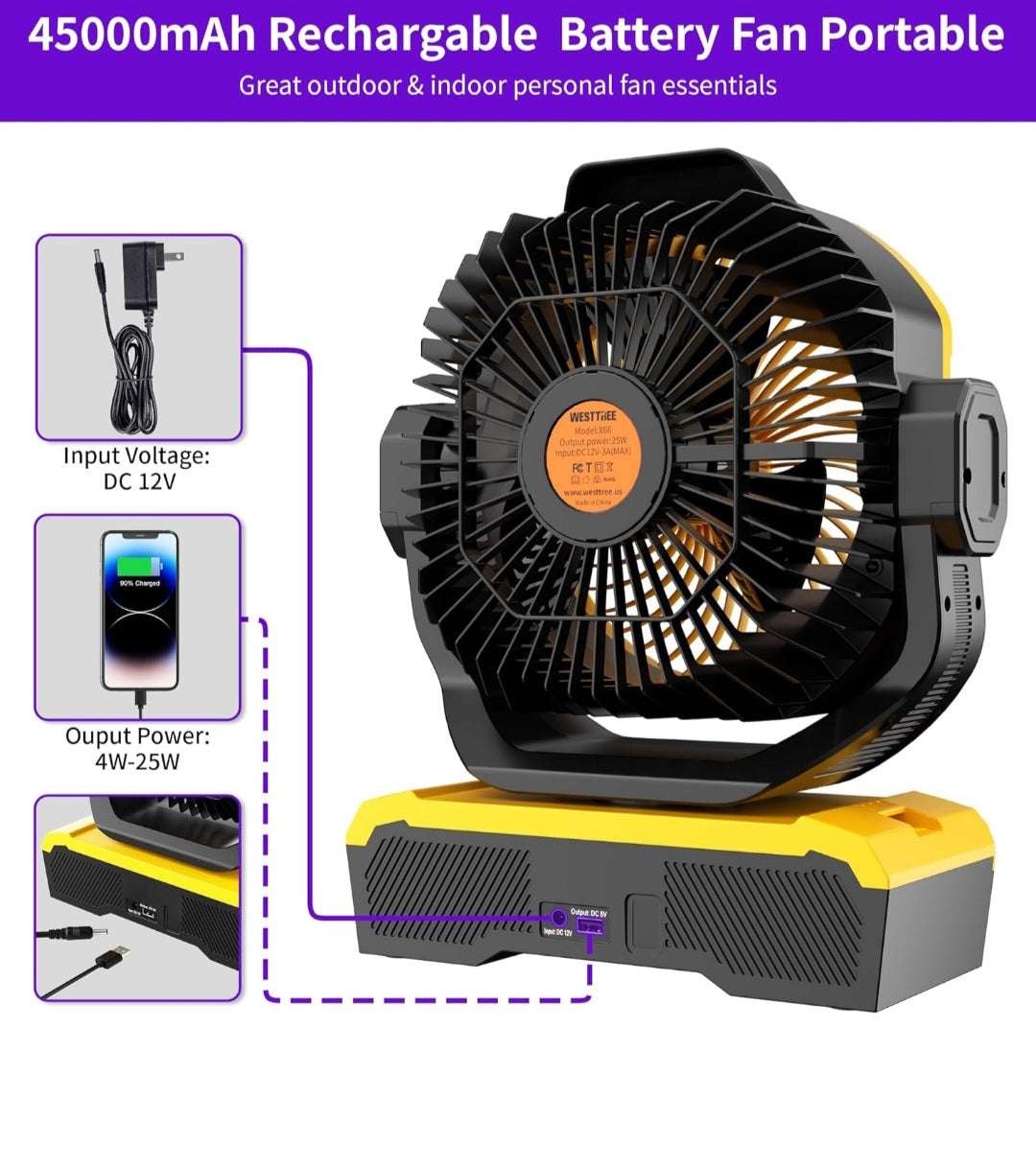 *WESTTREE large circulation fan. Built-in rechargeable 45000mAH battery for extended runtime. Input/output outlet for charging and backcharging.