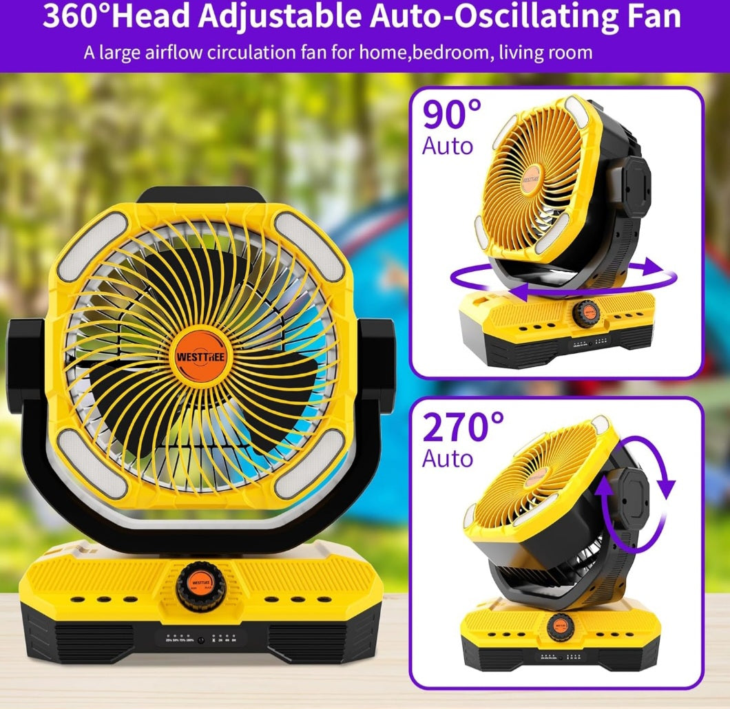 WESTTREE Battery Operated Large Airflow Fan/45000mAh/Rechargeable Cordless/360°Auto Oscillation & Timer/Quiet/Battery Powered/Portable with RGBW Lights